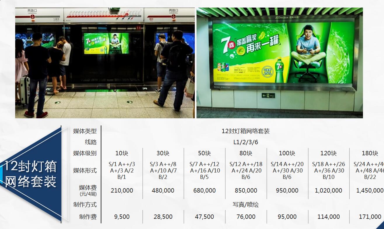 | 媒體類型:12封燈箱(3015型號燈箱) 媒體費用(元) S級:75,000; A++:55000; A+:42000; A:27000; B:21000 制作費:950元/張 ? |