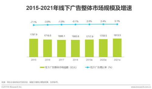 中國線下廣告因受到互聯網沖擊,整體規(guī)模在2015-2018年間呈現負增長趨勢,從1787.9億元跌落到1683.8億元。預計從2019年起,線下廣告整體規(guī)模將從負增長回復至正增長,且增長率將逐年提升。