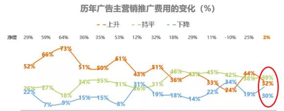 根據(jù)CTR發(fā)布的《2022中國(guó)廣告主營(yíng)銷趨勢(shì)調(diào)查》報(bào)告, 2022年,廣告主營(yíng)銷預(yù)算凈增比例出現(xiàn)收窄。32%的廣告主營(yíng)銷費(fèi)用上升,明顯低于去年的44%,而降低營(yíng)銷費(fèi)用的廣告主則占30%,較去年增長(zhǎng)11%。