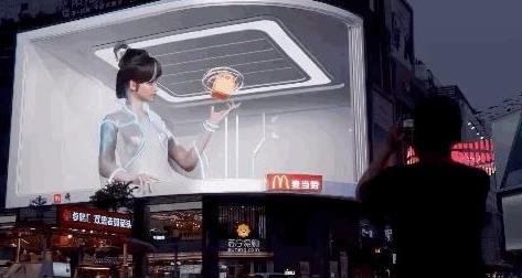 前者目前以裸眼3D屏幕為主,裸眼3D廣告往往能夠呈現(xiàn)出栩栩如生的視覺(jué)效果,雖然是廣告,但往往能吸引一大批觀眾駐足觀看并于線上自主二次傳播,達(dá)到廣告宣傳的出色效果。上了無(wú)數(shù)次熱搜的成都某古里大屏就是最好的例子,該屏甚至成了地標(biāo)景點(diǎn)的存在,無(wú)數(shù)外地游客特意駐足打卡。